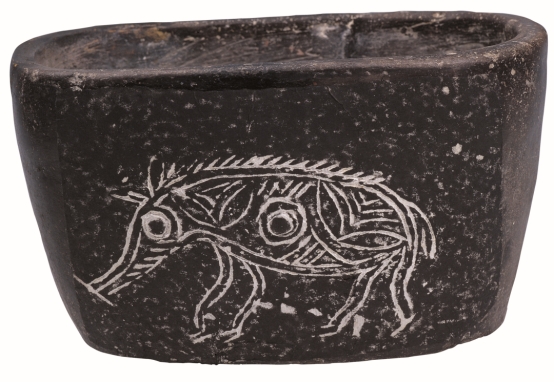 河姆渡遗址出土,距今约7000年。夹炭黑陶。高11.7厘米,口沿长21.7厘米,宽17.5厘米,底长15厘米,宽13.5厘米。平面呈长方形,侈口,圆角,器表打磨光亮。方钵两侧长侧面,各刻画一只猪纹,图案生动活泼,笔法简洁有力。猪纹长嘴,竖耳,高腿,短尾,粗鬃,腹略下垂,形象逼真,再现了河姆渡时期农业发展与家畜饲养相互依存的关系。