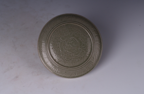 高4.8厘米,口径12.5厘米,底径10.2厘米。扁圆形,子母口,浅弧腹,高圈足外撇。盖面用两条弦纹分隔,内刻划牡丹缠枝纹,外刻划饰斜线纹。底部刻有“徐”字。施青釉不及底,釉色青绿滋润。