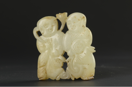 长3.8厘米,宽3.4厘米,厚0.5厘米,此佩白玉质地,色泽温润,局部有桂花沁,其上雕双童子像,阴刻出五官、服饰等细节,一童执莲蓬,另一童捧球,两童嬉戏无间,画面生动有趣。