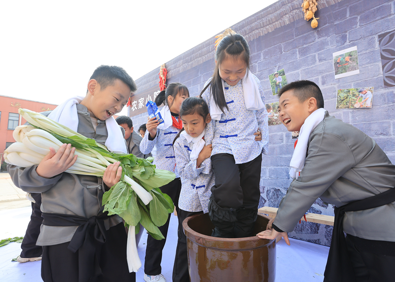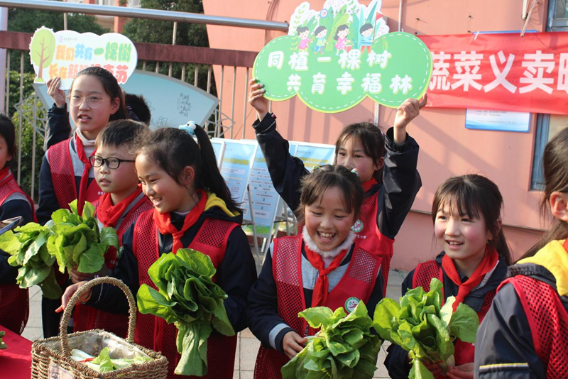 科学课上,老师以生态系统知识为切入点,引导学生探索生态运转逻辑;语文课上,老师聚焦生态散文剖析,培养学生审美与表达能力;美术课上,老师带领学生让创作走出教室,用落叶拼贴“银杏花束”,在自然美学中感悟资源再生价值;劳动课上,师生共同探究非遗竹编工艺,更通过设计“以竹代塑”生活方案,将可持续理念转化为实际行动;生态劳动课上,老师依托“节气农事日历”,让学生在校园生态农场经历播种、堆肥、收获全过程,体悟循环农业智慧。