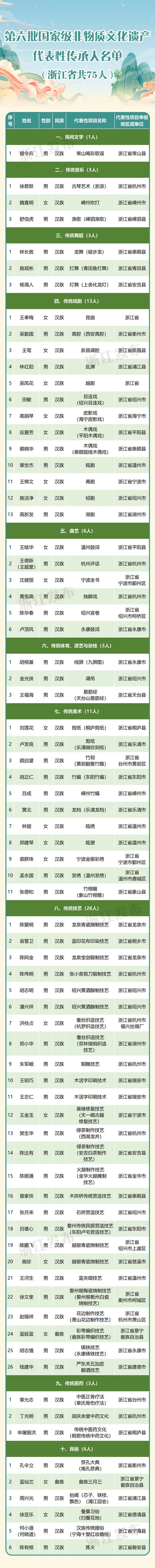 日前,文化和旅游部公布第六批国家级非物质文化遗产代表性传承人名单,共942人,浙江75人榜上有名,位列各省区市第一。目前,浙江省拥有国家级非遗代表性传承人271人,总数居全国第一。