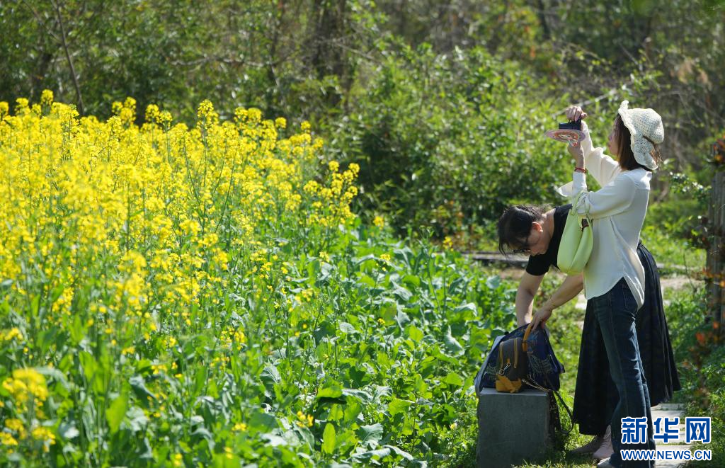 3月24日,游客在西溪湿地一片油菜花旁拍照。