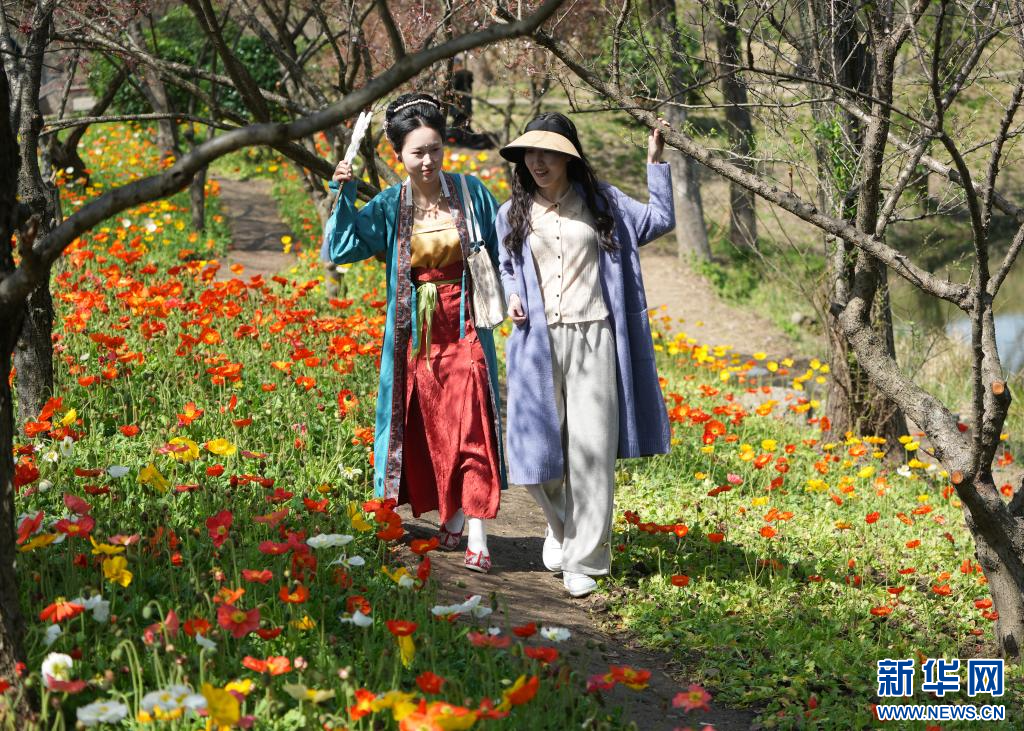 3月24日,游客在西溪湿地一条小径上欣赏开放的虞美人。