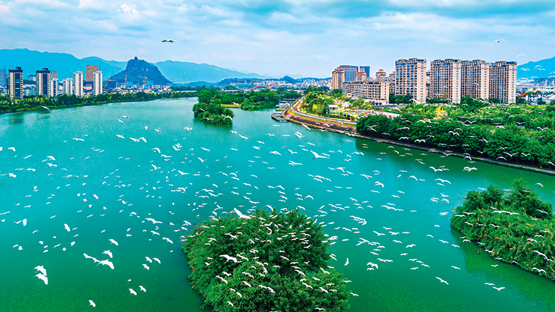 浙江省丽水市松阳县县城,候鸟成群结队在溪面上飞过(2023年10月摄) 何开健摄