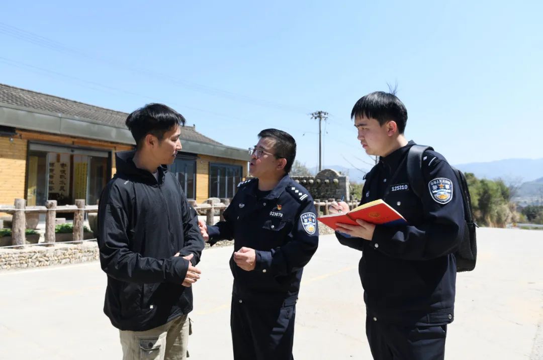 3月25日,梁弄派出所民警黄沛年、葛锡淡进行“背包警务”进村入户时走访杉野茶咖经营者。