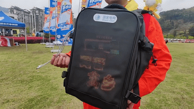 “‘xiōng fū gī lì(幸福吉祥)’,这边可以免费充电!”在“popo崽”营地的暖心驿站旁,来自国网景宁供电公司的“电小二”志愿者张建明背着带有LED屏的包为游客送上服务。