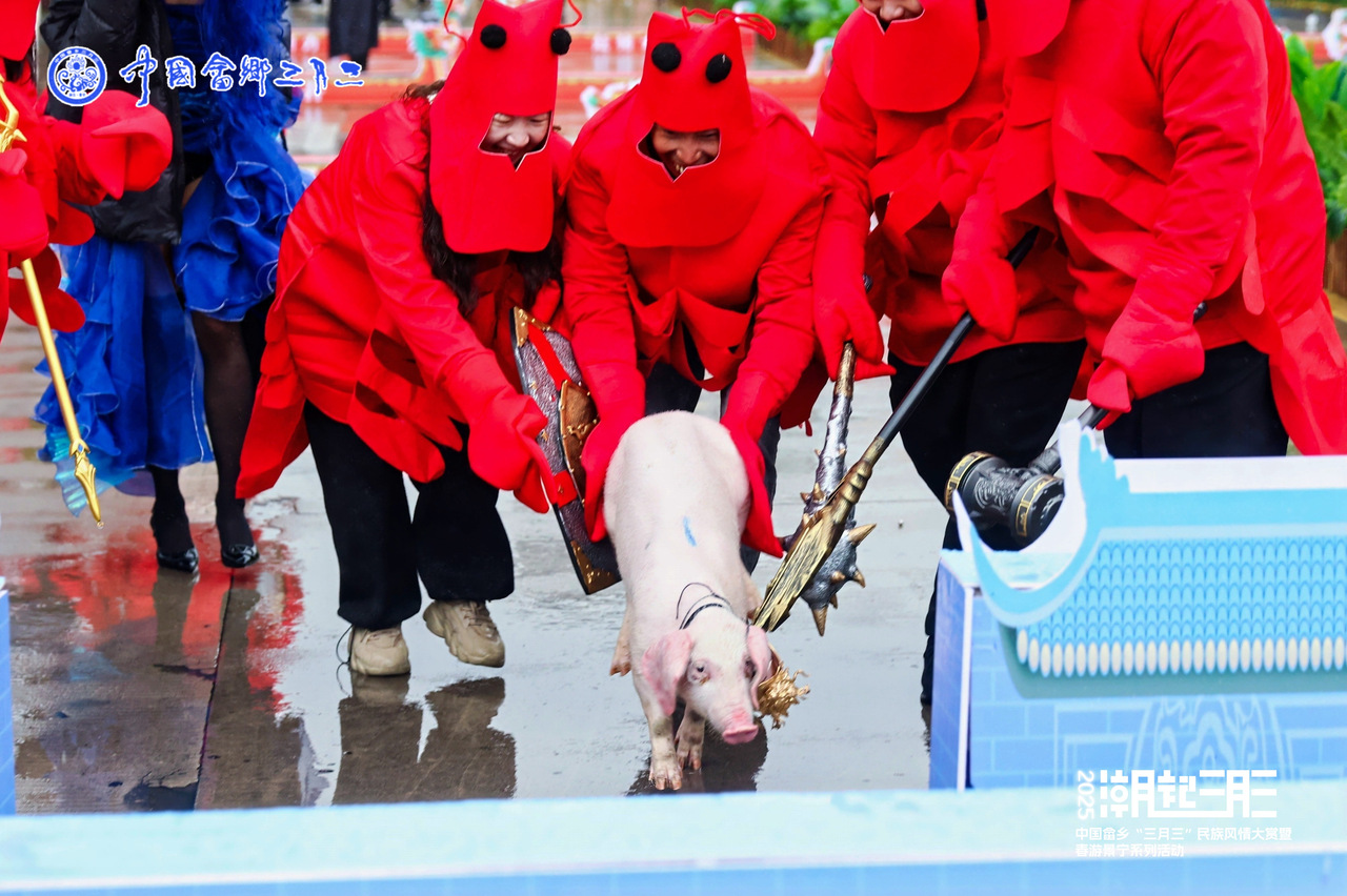 当天下午,欢脱的赶猪大赛成为全场关注的焦点。21个乡镇(街道)派出特色战队,拿出看家本领进行赶猪竞速。明星、主播、自媒体达人纷纷加入赶猪队伍,围观游客加油呐喊,将小众赛道活脱脱变成大众狂欢。