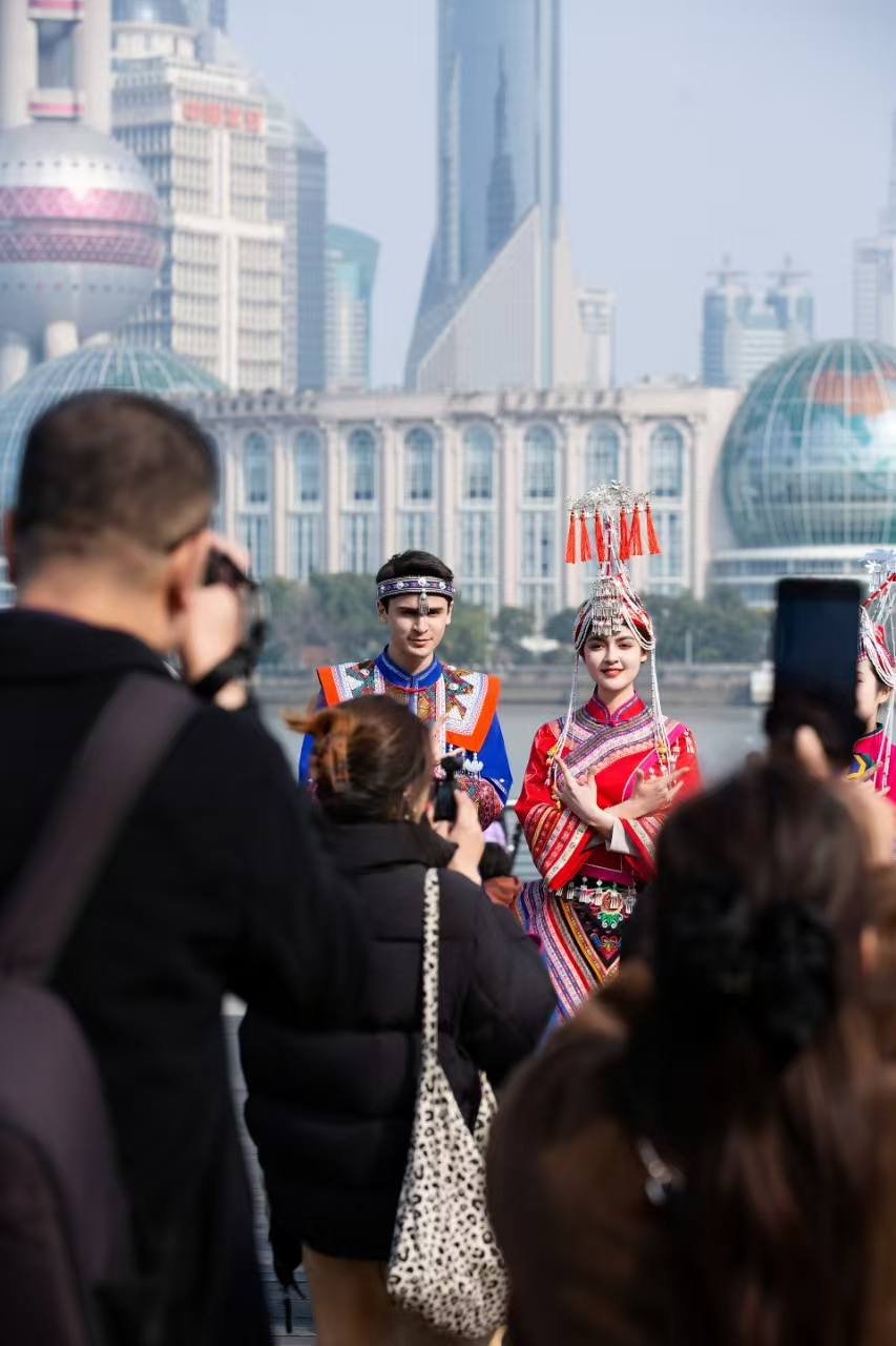 外籍自媒体达人身穿畲装现身上海外滩。图源景宁县委宣传部