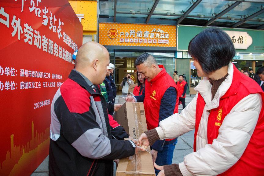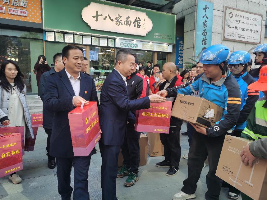 温州市总工会向户外劳动者和新业态劳动者代表赠送暖心礼包。朱健 摄