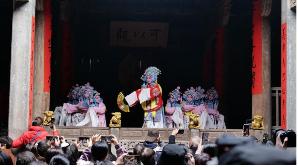 以“新叶三月三”为基础,新叶村今年举办首届农耕文化体验季,时间从3月下旬至4月下旬。3月31日即农历三月初三,是体验季中最热闹的一天。当天清早,由火铳手、锣鼓手、吹鼓手、三角旗手等角色组成的数百人的祭祖仪仗队在村里集结,前往村中庙里缅怀祖先、祭祀祈福。随后,“新叶昆曲”“李村抬阁”“龙游硬头狮子”等浙江省级非遗项目轮番展演。今年表演新叶昆曲的演员是一群学生,来自大慈岩中心小学。据该校老师介绍,为了传承该项非遗文化,从2009年开始,学校就开始选拔学生,教授新叶昆曲。