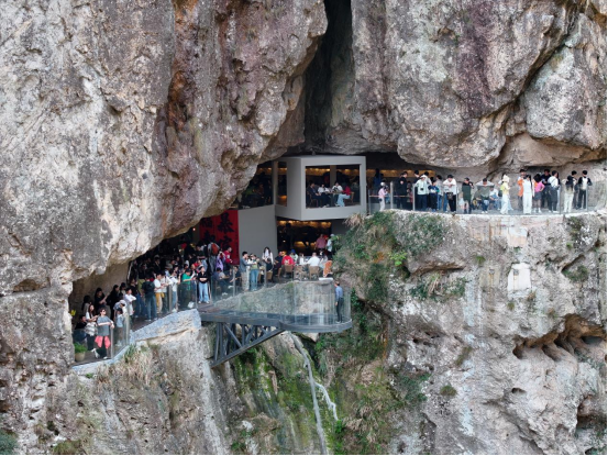 197米的大龙湫瀑布如银练飞泻而下,游客纷纷驻足拍摄其壮丽景观;200多米的高空“灵岩飞渡”表演,让游客秒秒惊心,直呼“不虚此行”;宇树机器人和机器狗,在“云端拾光”主题文旅项目的咖啡馆里来回运作,引来诸多游客与之互动体验、拍照留念……