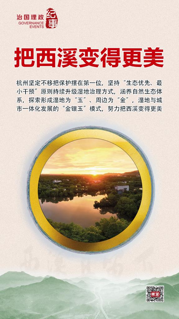 “水是湿地的灵魂,自然生态之美是西溪湿地最内在、最重要的美。要坚定不移把保护摆在第一位,尽最大努力保持湿地生态和水环境。要把保护好西湖和西溪湿地作为杭州城市发展和治理的鲜明导向,统筹好生产、生活、生态三大空间布局,在建设人与自然和谐相处、共生共荣的宜居城市方面创造更多经验。”习近平总书记这样强调。