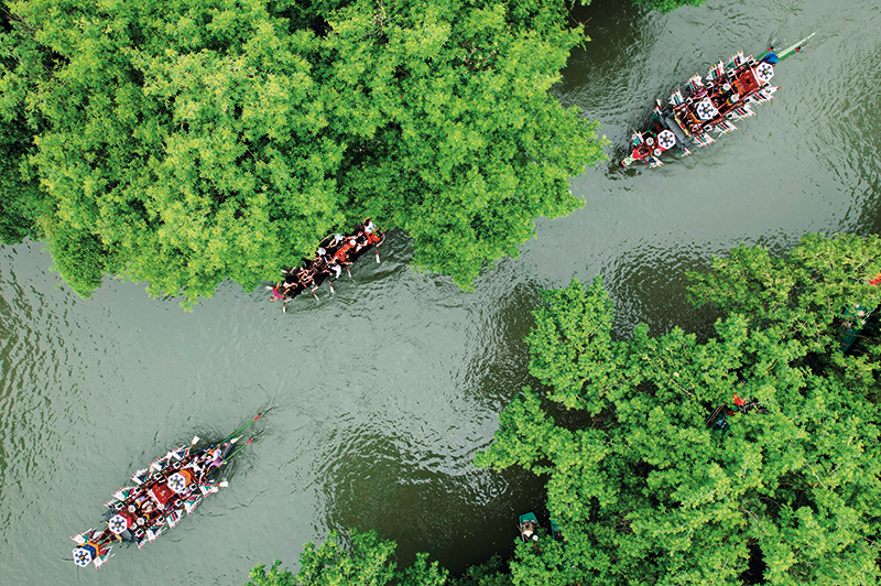 龙舟穿梭在西溪湿地的河道中(2023年6月22日摄) 龙巍 摄