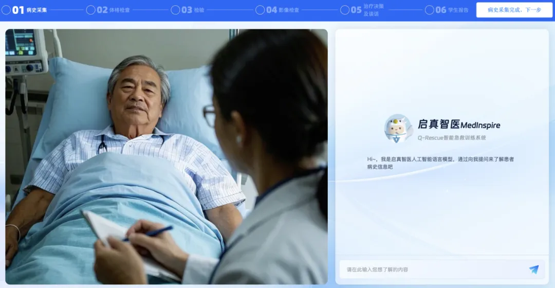 通俗地说,学生可以通过大模型“身临其境”地在课堂内进行一次抢救的实践学习,系统还可以对学生的抢救工作进行分析与评估。以学习抢救急性缺血性卒中患者为例,智能体可随机选取急性缺血性卒中病例(如发病2.5小时的右侧肢体偏瘫患者)开始场景模拟:学生需要进行病史采集、体格检查、检验及影像检查、诊断及治疗决策、医患谈话等全流程操作。