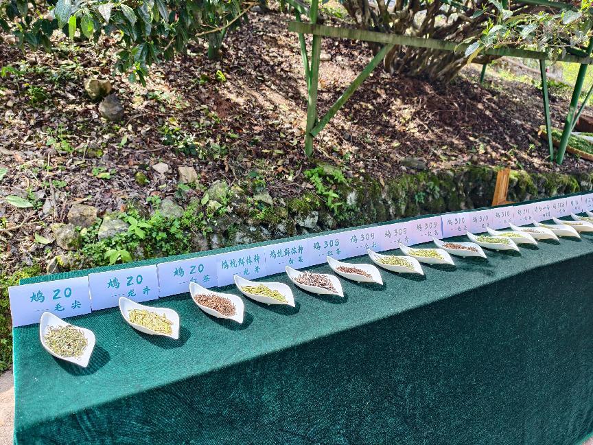 仪式现场,茶树王前整齐摆放的一排茶荷尤为吸睛。茶荷之中,鸠坑群体种、鸠坑早、鸠16、鸠20、鸠白一号等二十余种茶叶有序陈列。这些皆是“鸠坑种”孕育出的后代品种,它们作为众多优良品种的代表,静静见证这场庄严的献瑞仪式,象征着“鸠坑种”如同不息的薪火,代代相传,永不落幕。