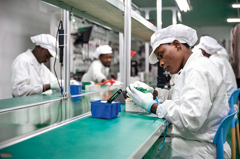 当地员工在正泰仪表肯尼亚工厂生产车间内组装电表(2024年8月9日摄) 王冠森摄 / 本刊