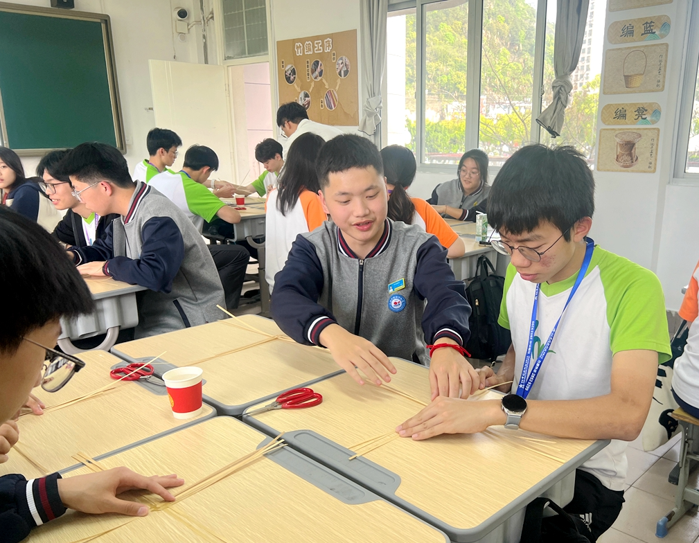“嗨哦啊,哟哈!”在“同唱渔民号”课堂,两地学生手持船桨,在老师的指导下,一边划桨一边激情满满地唱起渔民号。邓子熙是香港汉华中学高二的学生,他第一次学唱渔民号,满脸认真与兴奋,十几分钟后,他就已经唱得有模有样。“这对我来说是一次很新奇的体验,香港和玉环都靠海,这次来我想多多体验玉环的山海文化。”邓子熙说道。