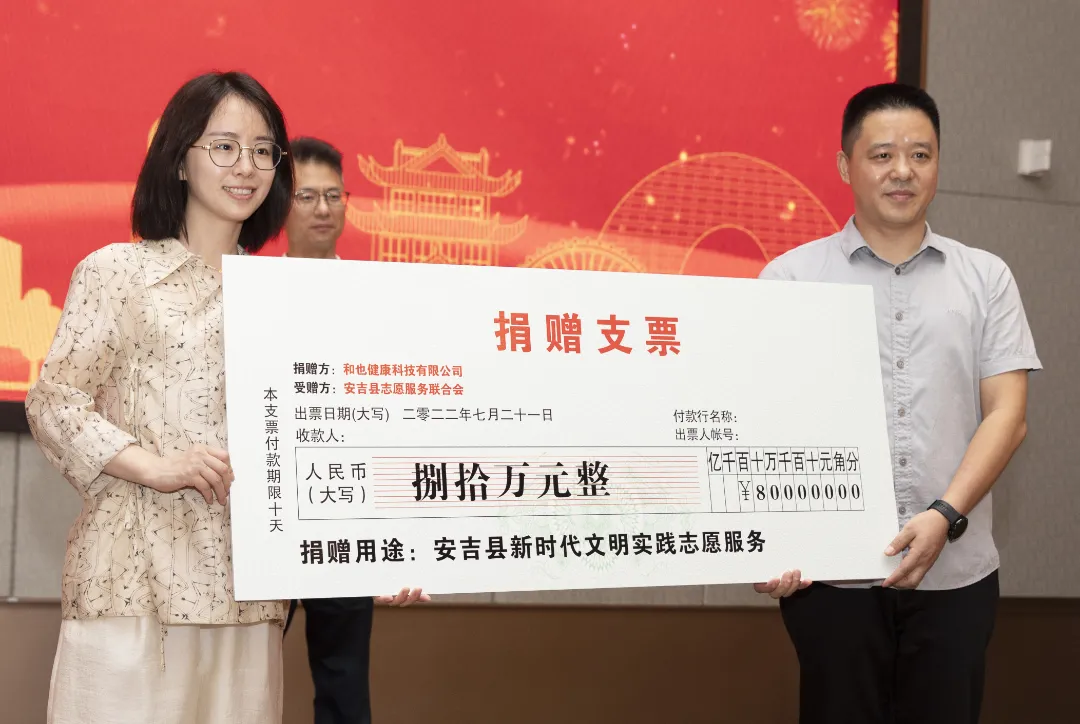大音希声,大爱无言。和也公司在会上向安吉县志愿服务联合会捐赠80万元,用于全县新时代文明实践志愿服务项目。和也健康科技有限公司总经理方彦雯,安吉县委宣传部副部长、县文明办主任、县志愿服务联合会长王孝国参加捐赠仪式。