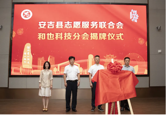 安吉县委常委、县委宣传部部长黄枫,和也健康科技有限公司总经理方彦雯共同为安吉县志愿服务联合会和也科技分会揭牌。