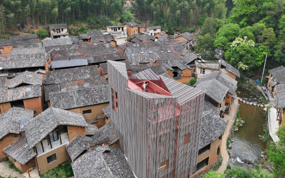 “织”美术馆是由村内一幢三层民居改造而成。建筑师借鉴传统布匹编织的原理为原本的建筑“织入”丝丝缕缕的“双色纱线”格栅,构筑出一个轻盈灵透的外立面,跳脱出传统的夯土房,又与整个村落和谐共生。说起“织”美术馆,丽水市文化特派员孙培最有发言权。