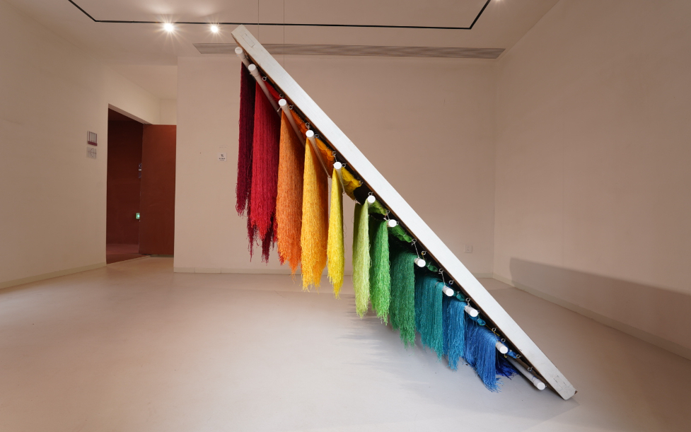 “织”美术馆首展的主题为“未织之境”,展出了8位国内外艺术家与当地村民共创的13件作品,涵盖竹编、棕编、畲族彩带等非遗技艺,融合了装置、摄影、综合材料等当代表现形式。尽管呈现形式有所不同,但作品灵感、取材都源于当地。《等青雨》是装置艺术家陶佳丽的作品,她从村民家中的竹蒸笼中获得灵感,采用重复聚合的方式让作品呈现不一样的美。意大利籍艺术家 Orlando Daga则采用在松庄村采集的箬叶来创作作品。