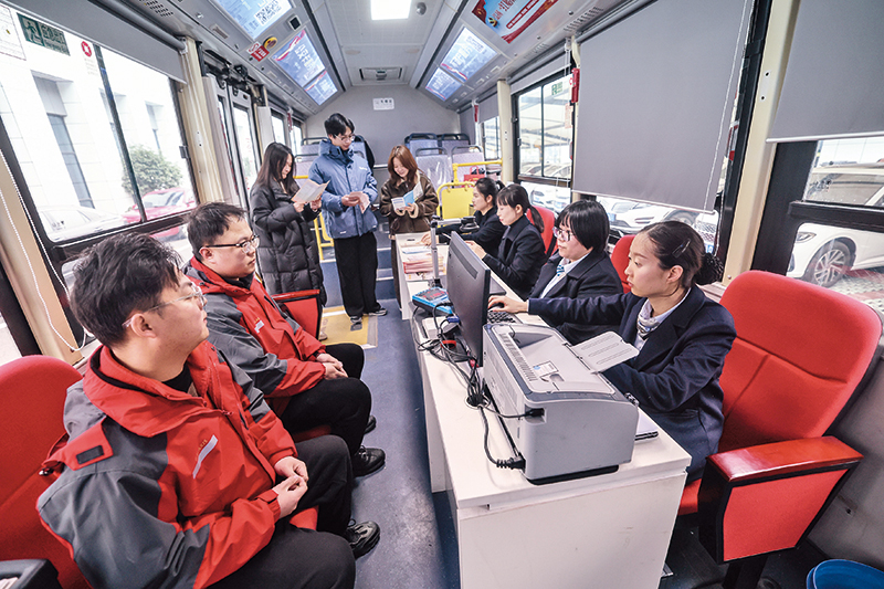 浙江省嘉兴市南湖区政务服务中心政务服务大篷车来到浙江凯乐士科技集团股份有限公司,企业员工在车上咨询社保、医保、人才等方面政策(2025 年 2 月 25 日摄) 徐昱摄 / 本刊