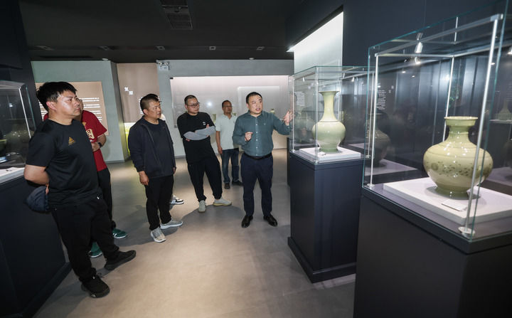 在浙江省慈溪市施山社区施家山公共文化空间的越窑青瓷施珍艺术馆内,文化特派员应周挺(右一)在给参观者介绍青瓷作品(2025年4月9日摄)。新华社记者 徐昱 摄
