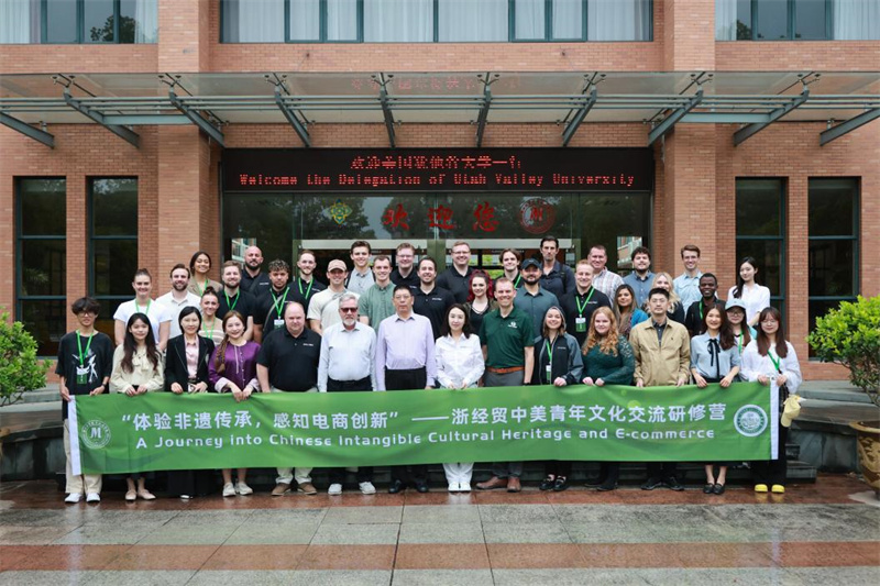 这是在2025年职业教育活动周期间,浙江经贸职业技术学院联合美国犹他谷大学举办的一场中美青年文化交流研修营活动结营仪式上的精彩瞬间。该活动以“体验非遗传承,感知电商创新”为主题,在为期6天的研修活动期间,32位美国师生以“数字创新力+文化传承力”为双核驱动,深入电商行业,感受科技经济的融合创新;学习中华传统文化,领略非遗之美,在中美青年的技术技能对话中感受职业教育服务文化传承创新、赋能数字经济发展的时代担当,共筑中美友谊桥。