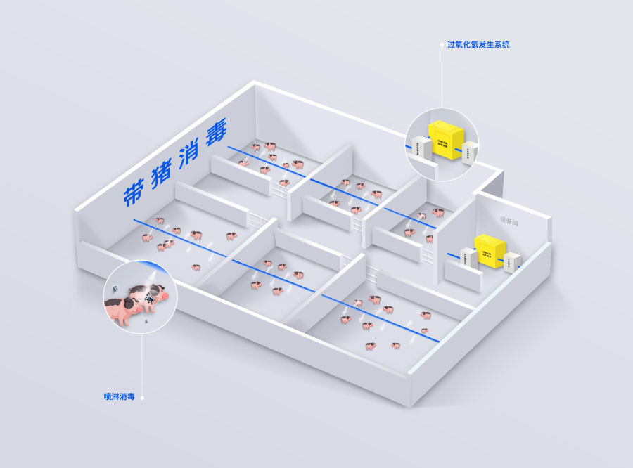 另外,整个设备不需要废水处理机制,过氧化氢在完成消杀后,残留浓度已非常低,并自发分解为水和氧气,相当于又用清水冲洗了一遍猪场,分解产物可随养殖场常规排水系统自然排出,实现零污染闭环。