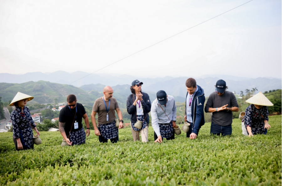 午后,西白山村的千亩茶园中,代表们腰系竹篓,指尖轻掐嫩芽,在采茶农户指导下参与采摘体验。“采茶要选一芽两叶,指尖轻轻提采,不能掐断。”茶农一边示范,一边耐心讲解。代表们小心翼翼地尝试着,时而因成功采到标准嫩芽而欢呼,时而为动作不够标准向茶农请教。来自墨西哥MAG Group的Luis Macias表示:“这里太美了,这是我第一次采茶,感觉很有意思。我要把这些拍下来并分享给我的朋友们。”