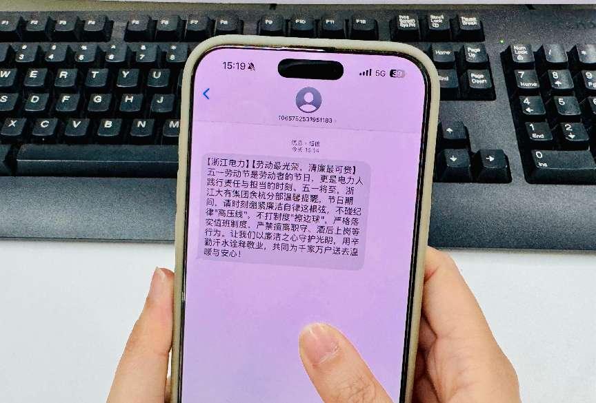 “劳动最光荣,清廉价更高。五一将至,浙江大有集团余杭分部温馨提示:节日期间,请时刻绷紧廉洁自律这根弦,不碰纪律高压线,不打制度擦边球。”4月28日,伴着清脆的手机提示音,一条简洁有力的廉洁短信送达浙江大有集团余杭分部的每一位干部职工手中,为即将来临的五一假期敲响了廉洁自律的警钟。