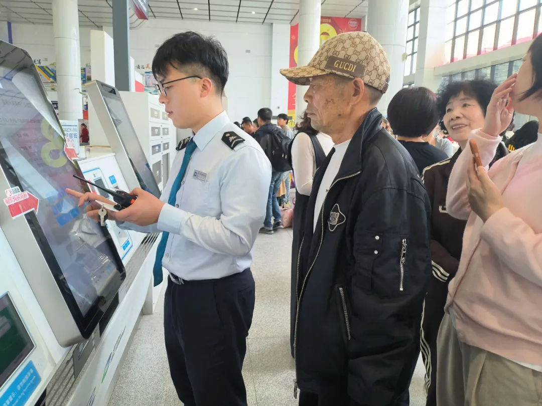 车站工作人员帮助乘客购买车票。