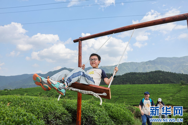5月2日,小朋友在乾潭镇胥江村的千亩茶园内荡秋千。