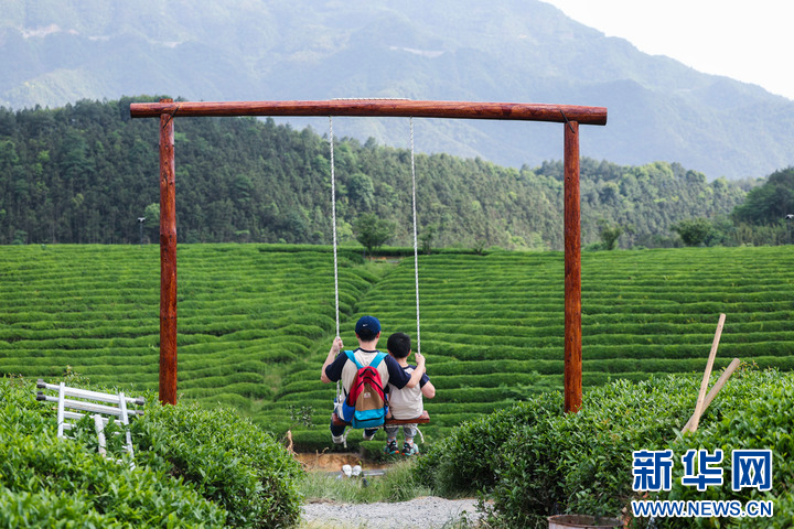 5月2日,游客在乾潭镇胥江村的千亩茶园内荡秋千。