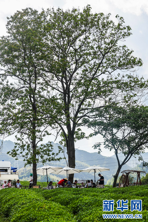 5月2日,游客在乾潭镇胥江村的千亩茶园内休憩。