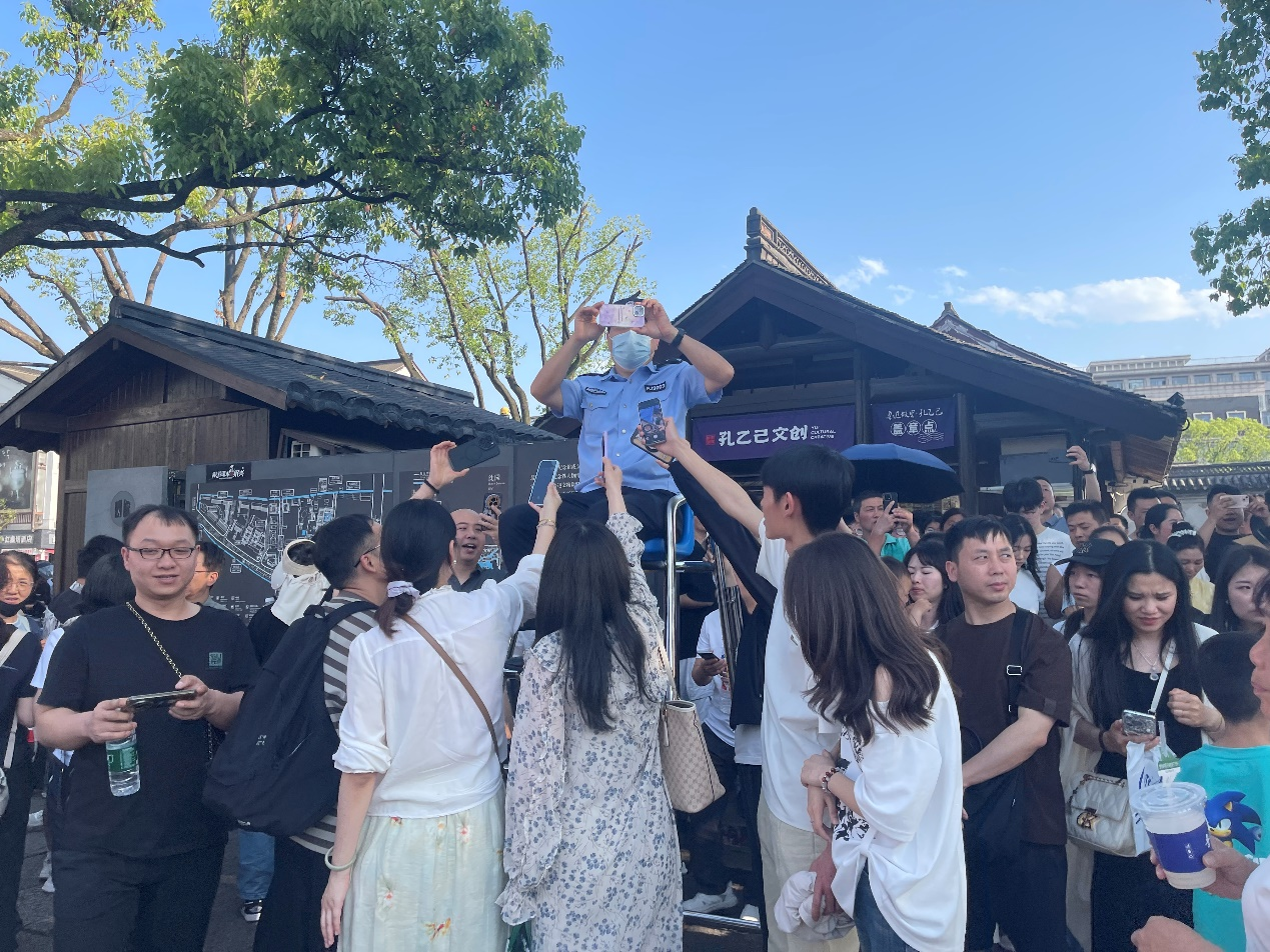 5月1日早上八点,被网友称为“人形三脚架”的绍兴市越城区塔山派出所社区民警金智龙准时上岗鲁迅故里警务站。他的执勤座椅原本是用于监测景区人流的瞭望台,但因能提供鲁迅浮雕与游客合影的最佳角度,逐渐演变为“拍照服务点”。他在监测广场人流量、预判客流高峰的同时,主动接过游客递来的手机,帮助调整姿势、寻找光线,甚至模仿游客的拍照手势,确保每张照片都能让游客满意。“五一当天应该拍了三四百张,这是我的随手之举罢了,希望能让游客在来绍兴的第一站就感受到绍兴的温度。”金智龙说。