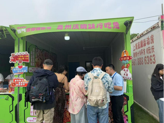 活动现场,金口河区展位前人头攒动。庆晓妹冷吃兔负责人刘涛穿梭在人群中,手举试吃盘热情吆喝:“地道四川味,先尝后买!”独特的麻辣香气引得年轻乐迷们驻足。同样火爆的还有乐山传统小吃绵绵冰展台,晶莹剔透的冰沙淋上果酱,在初夏的燥热中为乐迷送去清凉。
