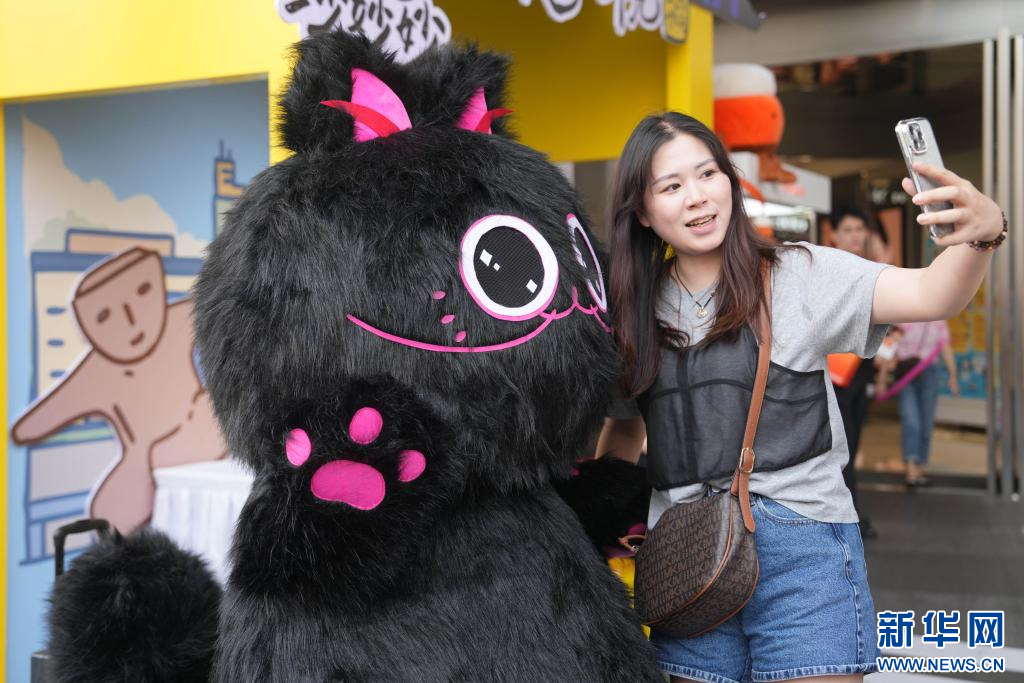 游客在湖南长沙五一商圈的马王堆文物文化快闪活动中与狸猫“妙妙”合影(5月2日摄)。这只名为“妙妙”的狸猫原型来自长沙马王堆汉墓出土的文物。新华社记者 薛宇舸 摄
