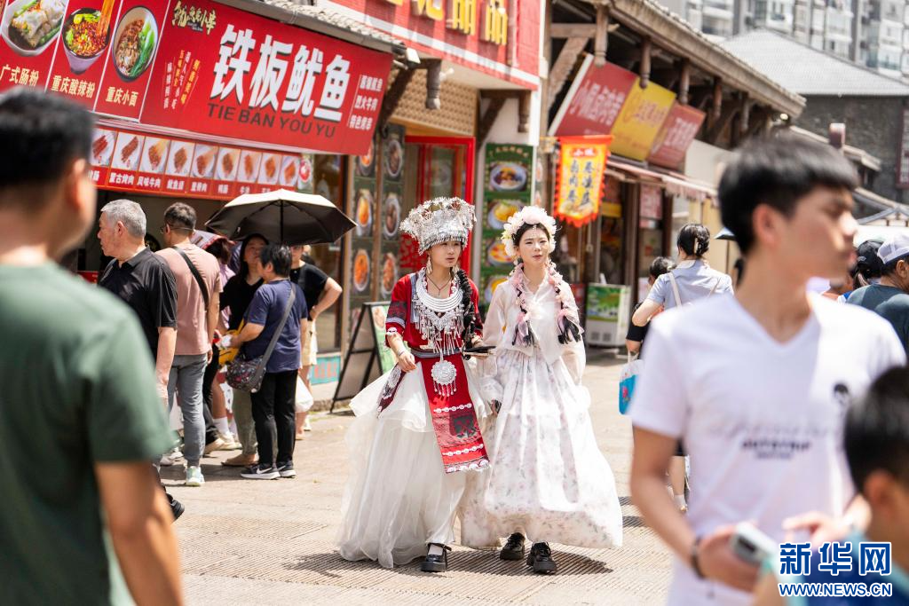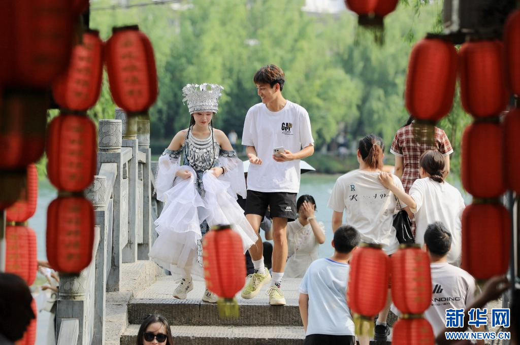 游客在贵州省黔东南苗族侗族自治州镇远县古城游览打卡(5月3日摄)。新华社发 邰胜智 摄