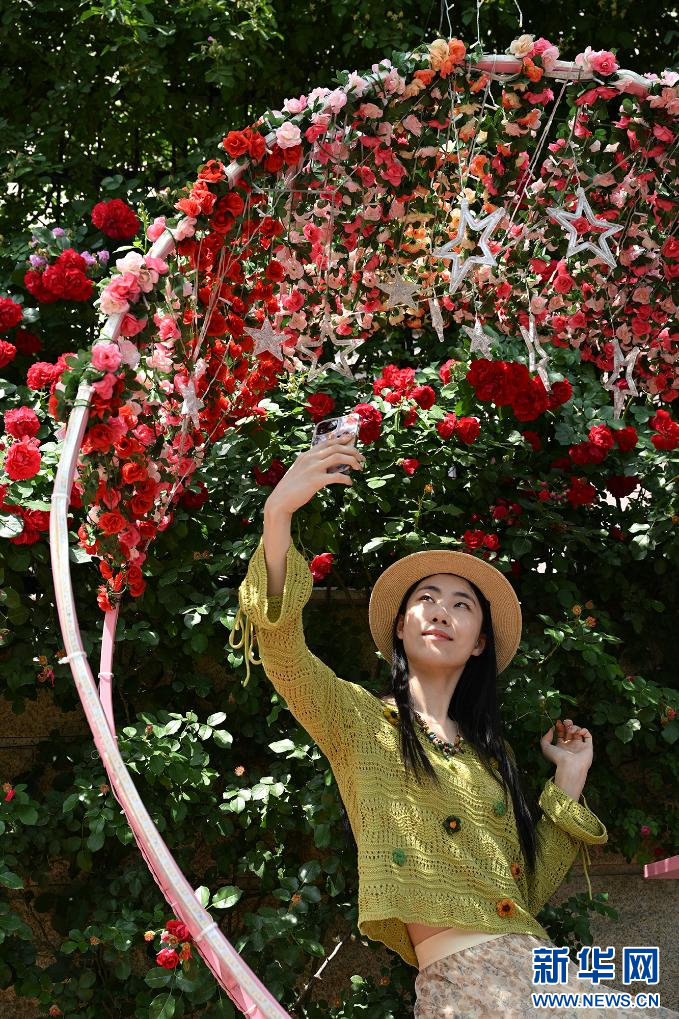 5月4日,一名年轻人在河南省商丘市睢阳区万达路某小区蔷薇花墙打卡拍照。新华社发 李恒 摄