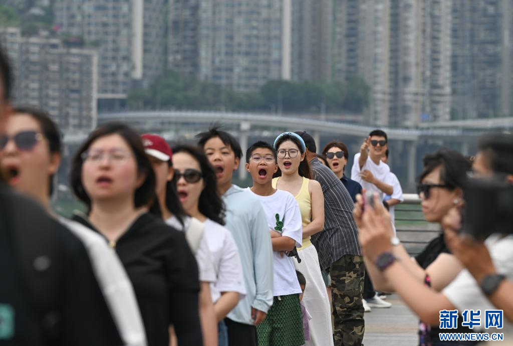在重庆市北滨路,来自各地的游客摆出“吃”轻轨的姿势拍照(5月4日摄)。新华社记者 陈诚 摄