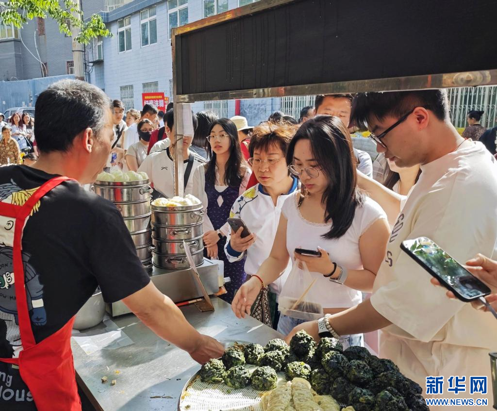 游客在陕西西安东仓门早市购买特色小吃(5月3日摄)。新华社记者 邢广利 摄