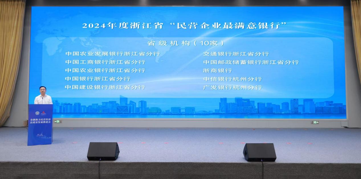 会上,人民银行浙江省分行党委委员、副行长闫真宇发布 2024 年度浙江省“民营企业最满意银行”评选结果”。今年年初,在广大民营企业的积极参与下,人民银行浙江省分行、省工商联组织评选出2024年度省市县三级百家“民营企业最满意银行”,以及 “服务‘创新浙江’先锋银行”、“服务‘开放浙江’典范银行”。