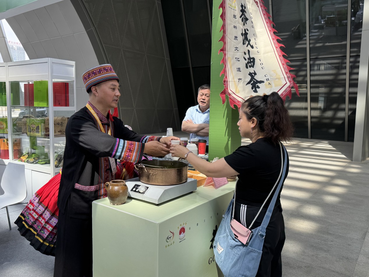 在品鉴会现场,恭城油茶展台向路人展现着独特的瑶族风情。展架上陈列着精致茶碗,生态食材,还有精致包装的产品礼盒。非遗传承人手持茶槌轻快捶打,茶香裹着姜蒜辛香随“咚咚”声飘散。沸腾的茶汤倾入碗中,金黄透亮的茶面上浮着炒米、花生,引得宾客驻足围观品尝。