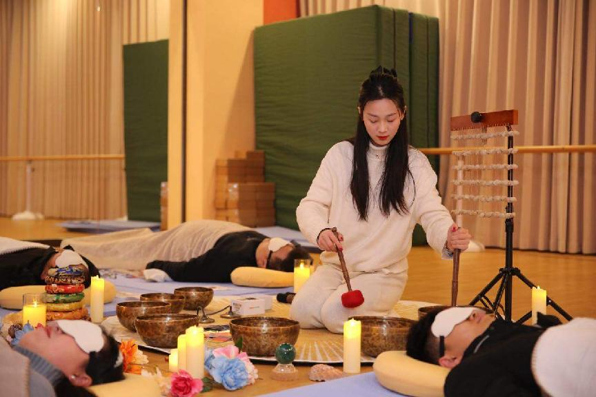 柔和的灯光、轻松的音乐、安神的香薰……夜幕降临,华灯初上,位于浙江诸暨经济开发区的青少年宫一间文体活动室内,颂钵疗愈老师齐曼伊手持钵锤,在钵体上轻轻敲击,平躺在一旁的学员在空灵之音中,渐渐进入睡眠模式。