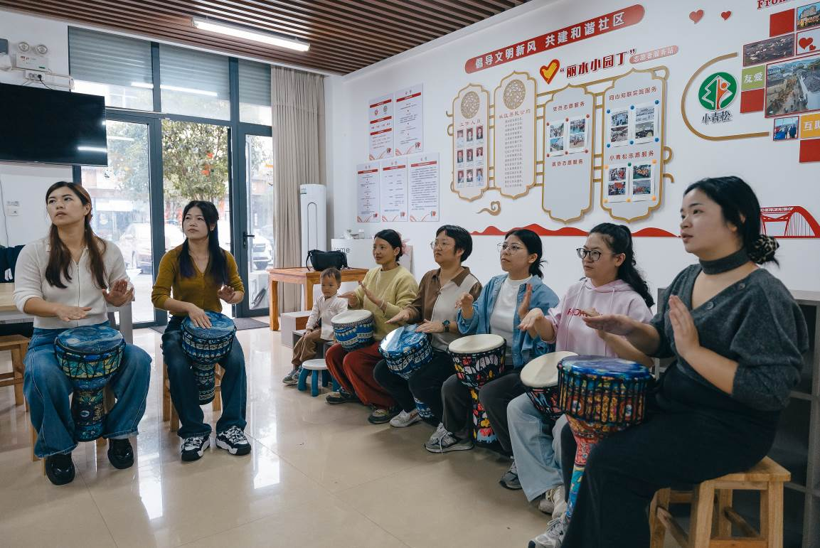 作为村里的广场舞爱好者,金家兰对“乡村艺校”并不陌生。2024年5月首期课程启动时,松阳县文化馆选派专业教师开设抖音热舞、八段锦、瑜伽等免费课程,她第一时间报了抖音热舞班。“老师指导大家学习舞蹈动作,比跟着视频学带劲多了,每次跳完都浑身畅快。”金家兰说。如今,她不仅学会了爵士舞,还花200多元购置了非洲鼓,在击打节奏中感受音乐的魅力。