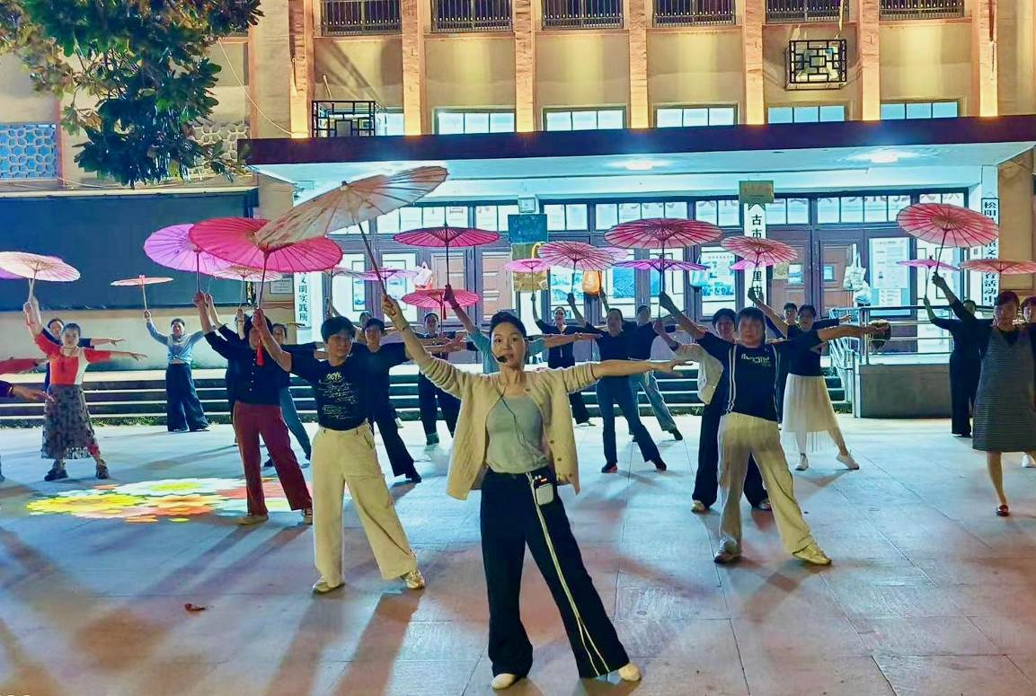 在古市镇,由老电影院改造的综合文化站成了村民的“精神家园”。每天傍晚,文化站外广场上《人间烟火》的旋律随晚风飘扬,舞蹈学员们踩着节奏旋转伞面,伞花绽放间尽显专业训练的韵味。“她们太热情了,65岁的大姐上完90分钟的课,还追着我问动作的细节,脸上满是兴奋的表情。”舞蹈老师阙晓华感慨道。