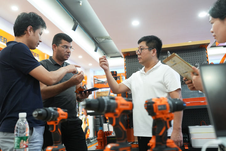 在义乌国际商贸城,商户向突尼斯客商介绍一款电钻(2024年10月9日摄)。新华社记者 翁忻旸 摄