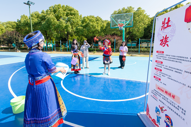 活动现场,民族特色文化展示区化身为沉浸式“文化课堂”。彝族陀螺旋转竞技、壮族绣球传递祝福、藏族拉弓彰显勇毅……八大民族传统游戏以互动体验诠释团结内涵。两江社区展区则通过实物展示和互动体验,让师生们深切感受到基层社区在促进民族团结方面的创新实践。