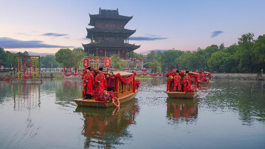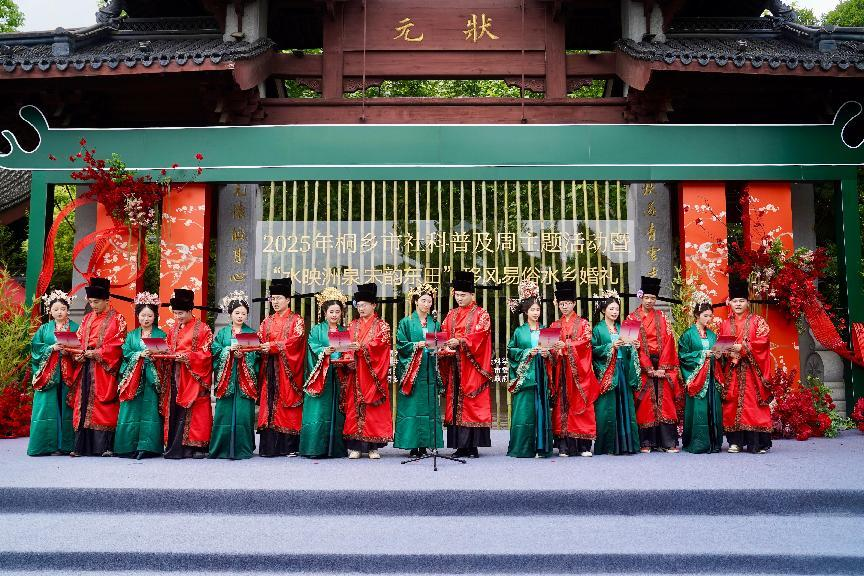 碧水映红船,才子会佳人。5月17日,2025年桐乡市社科普及周主题活动暨“水映洲泉 宋韵东田”移风易俗水乡婚礼在浙江嘉兴桐乡市洲泉镇东田村举行,8对新人集体向爱宣誓,体验具有浓郁宋韵风情的中式婚礼仪式,在温馨浪漫中感受文明节俭的婚嫁新风尚。